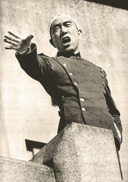 If Bushnell represents a martyrdom of modern despair, then Yukio Mishima represents the martyrdom of anachronistic zeal. Possessing a soul suited to the samurai of ages past, Mishima longed for a transcendent, beautiful death.